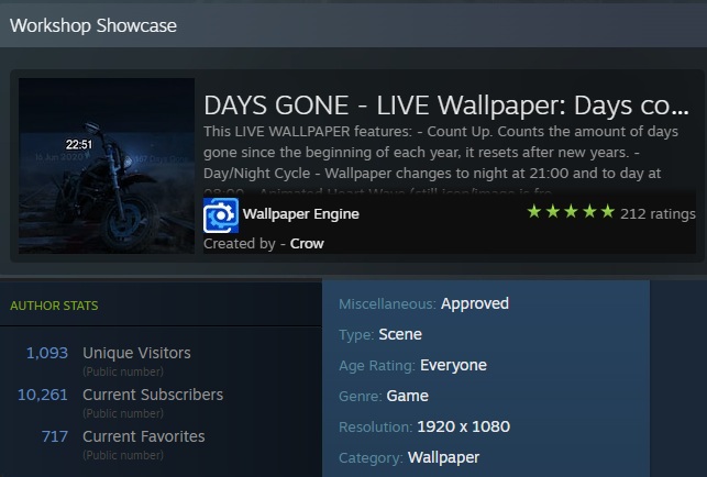 Jag har skapat en Live Wallpaper för Wallpaper Engine som har blivit Approved av utvecklarna ( det innebär att mitt verk har godkänts av utvecklaren för att synas offentligt.) Temat är från ett TV-spel som heter Days Gone. Den har över tio tusen nedladdningar!